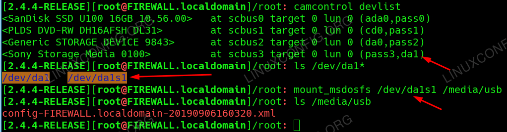 # mount_msdosfs /dev/da1s1 /media/usb Potwierdź, że napęd USB jest teraz zamontowany i możesz uzyskać dostęp do pliku kopii zapasowej konfiguracji pfsense: